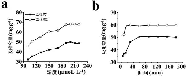 圖1:兩種活性炭對銅離子的(a)等溫吸附和(b)動態吸附。