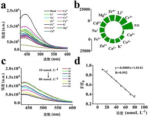 圖2:(a)12種金屬離子的納米活性炭點的熒光發射光譜,(b)360nm處的熒光強度,(c)不同濃度Cu2+的熒光發射光譜,(d)Cu2+檢測的線性曲線。