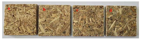 圖1:具有不同活性炭添加比例的歐松板:(a)0%,(b)1.5%,(c)4.5%,(d)7.5%。