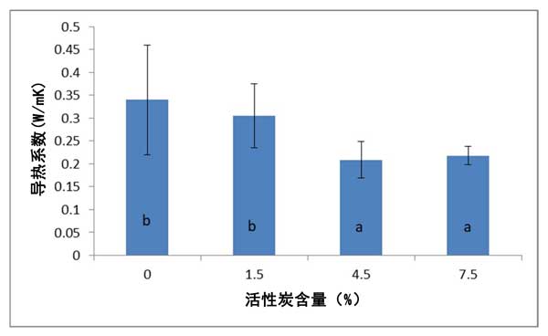 圖3:活性炭增強歐松板的導熱率值。圖3中的字母(a和b)表示具有同等重要性的樣本組聚集在一起。