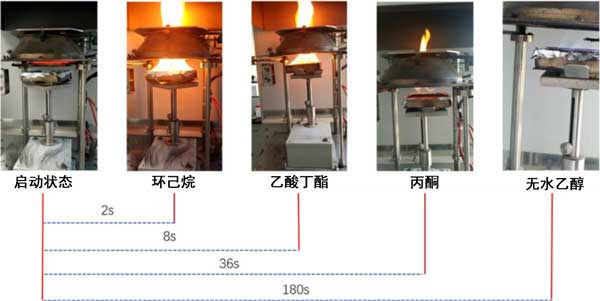 圖3顯示了四個樣品的初始燃燒火焰和點火時間。可以看出,四個樣本的點火時間按照環己烷<乙酸丁酯<丙酮<純無水乙醇的順序遞增。顯然,吸附VOCs后的樣品更易燃燒,其中環己烷樣品是最容易被點燃的一種。從火焰尺度來看,吸附樣品的火焰高度較大,燃燒強度較強。此外,純無水乙醇樣品的火焰顏色為淺藍色,表明純無水乙醇燃燒時樣品的表面溫度低于其他三個吸附樣品。