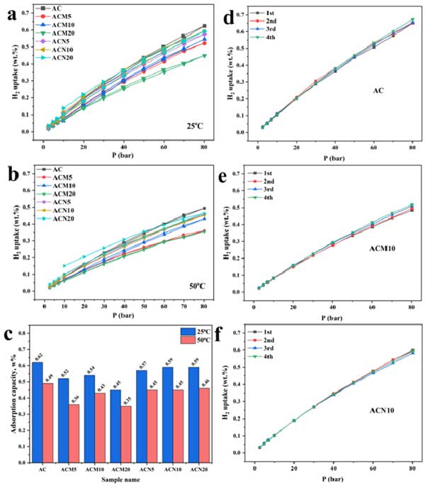 氫氣儲存材料在實際應用中需要具備良好的循環性能。作者對AC、ACM10、ACN10等樣本進行了若干次(例如10次或更多)吸附–解吸循環測試,以評估其穩定性。原文圖2d、5e、5f展示了循環曲線。