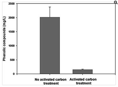 在生物乙醇生產過程中,有毒的呋喃衍生物(糠醛和5-羥甲基糠醛)和酚類化合物在酸解過程中生成,已知會抑制細胞生長和乙醇生成。在使用20g玉米殼和4%(v / v)H 2 SO 4的水解物制備后,我們通過活性炭處理除去了這些化合物。如圖4所示,該過程導致總酚值從2015.2降至153.3 mg / l,相當于總酚類化合物減少92.3%。然后將該活性炭處理的水解產物用于生物乙醇生產,并與未處理的水解產物進行比較。