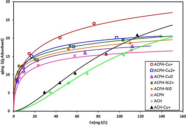 BT,DBT和4,6-DMDBT在浸漬有不同銅或鎳物種的活性炭纖維上的吸附等溫線如圖1,圖2和圖3所示。將實驗吸附數據擬合到LF模型并繪制以顯示這些圖中的整體等溫線趨勢。大部分吸附劑的吸附數據符合LF模型,相關系數大于0.94。與活性炭纖維等溫線不同,兩種介孔活性炭和ACH-Cu +的 DBT等溫線碳含量較低,相關系數分別為0.81和0.86。在低濃度(<50mg S / L)下觀察到的微孔活性炭纖維的較高吸附親和力是由于DBT在高能超微孔中的吸附所致;钚蕴坷w維等溫線也類似于標準I型等溫線。然而,對于中孔活性炭,觀察到等溫線的線性趨勢,表明在測試濃度范圍內具有相似的吸附親和力。盡管微孔碳在〜200mg S / L的平衡濃度下達到其最大TC容量,但是兩種測試的活性炭在較高濃度(>200mg S / L)下預計具有更高的容量。我們的結果表明,銅或鎳浸漬提高了活性炭的吸附能力。然而,這項研究量化了不同單個金屬物種對噻吩類化合物吸附的重要性。這項工作的一個具體的方法中,對吸附劑(所述金屬浸漬之前)到高溫氫還原除去活性炭的酸性氧官能團。因此,可能作出的貢獻的氧酸性基團可以排除在外。所有活性炭纖維具有相似的微孔性和可比的超微孔性。因此,活性炭對噻吩類化合物的吸附增強主要歸因于特定負載的銅和鎳物質的影響。