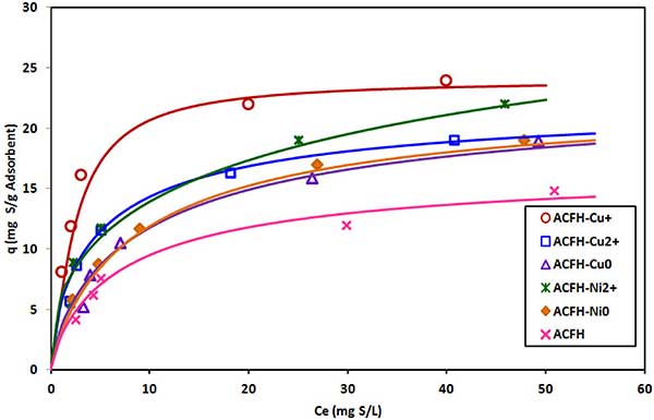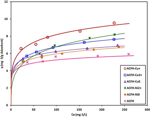 圖3. 浸漬有不同銅和鎳物種的活性碳纖維上4,6-DMDBT的吸附等溫線。