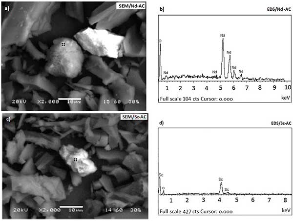 活性炭吸附后表面形貌也發生改變。圖2a、c表示存在幾個不同形狀和大小的亮點,廣泛分布在其孔隙中。值得注意的是,在所有的實驗中,兩種研究吸收劑的EDS光譜都顯示出比Sc更高的Nd負載量。這一結果與動力學研究中所見的Nd吸附趨勢一致。