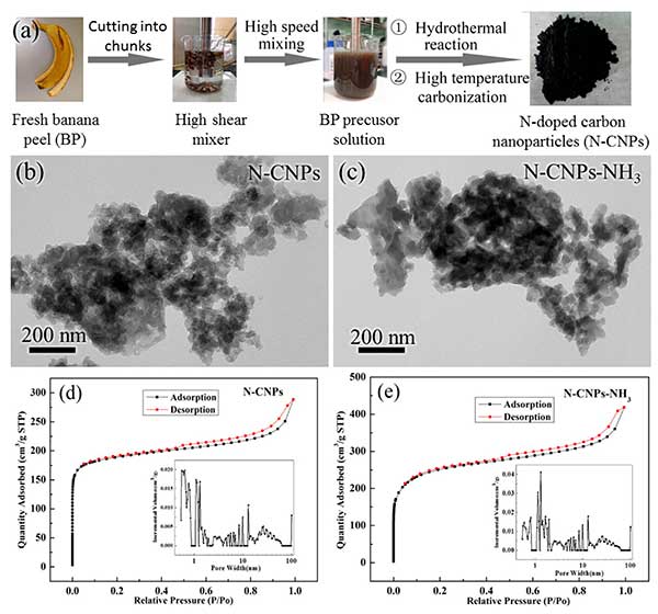 圖1.(a)從新鮮香蕉皮制成活性炭的過程的描述。(b)活性炭和(c)氨活化的活性炭TEM圖像。(d)活性炭和(e)氨活化的活性炭氮吸附等溫線和相應(yīng)的孔徑分布。