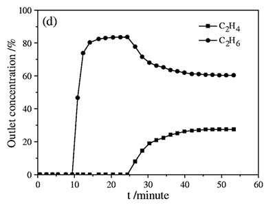在圖1中可以看出乙烯和乙烷在最初的幾分鐘內完全被吸附,但乙烷在8分鐘后穿過管柱。在最初的25分鐘內,吸附劑保留乙烯,出口物流不含乙烯,然后再通過。最后,50分鐘后出口氣體濃度返回到進料氣體濃度,表明該吸附劑樣品飽和。乙烯的吸附量是通過整合相關穿透曲線獲得的。