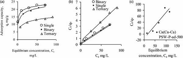 圖1. Cu(II)(a,b)和Ca(II)(c)的Langmuir等溫線,而Cu(II)吸附是從單(Cu),二元(Ca-Cu)和三元(Cu-Ni-)進行的Pb)溶液和Ca(II)被活性炭吸附在二元溶液(Ca-Cu)中,初始pH值為5,初始濃度從<0到<100 mg L-1。
