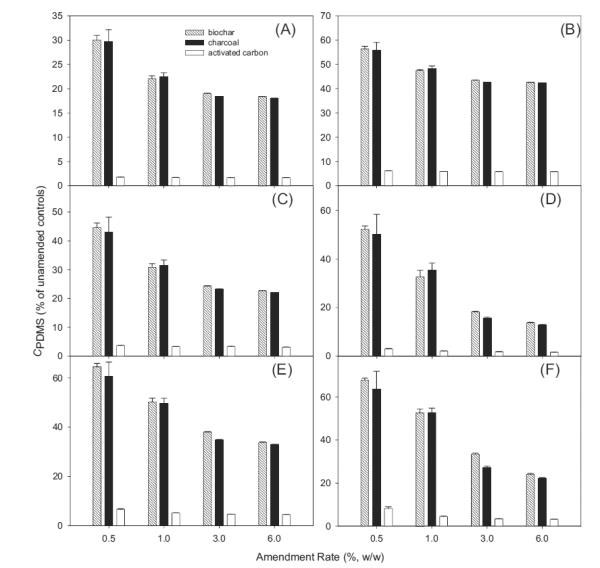 在平衡時,通過活性炭吸附或隔離PBDEs反映了它們在PDMS纖維(C PDMS)上檢測到的水平的變化。在JL沉積物中,隨著活性炭修正,C PDMS顯著下降,并且活性炭的類型之間的減少不同(圖2)。例如,當用生物炭以0.5%修正JL沉積物時,C PDMS降低至未沉降沉積物中的水平的30.0-67.8%。木炭(29.7-63.5%)的效果與生物炭相似(圖2)。相比之下,活性炭修正沉積物中C PDMS的下降幅度更大(圖2))。例如,在含有0.5%活性炭的JL沉淀物中,對于不同的同源物,C PDMS降低至未改良處理的水平的1.8-8.1%。平均而言,添加1.0%的活性炭導致所選BDE同系物的C PDMS降低至對照水平的1.7-5.9%,這表明活性炭在沉積物中螯合PBDEs的能力遠遠高于其他黑碳材料。