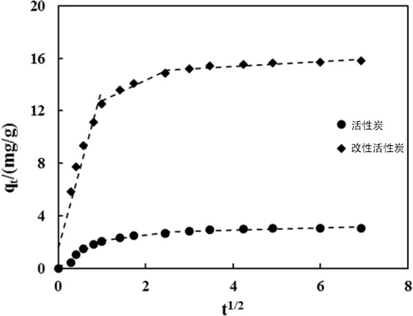 磺胺二甲嘧啶在活性炭和改性活性炭上的吸附和擴散過程可分三個階段描述,如圖2所示。由于在第一階段吸附在活性炭表面上,吸附速率最初很高。然后,發生快速的顆粒內擴散過程,其中磺胺二甲嘧啶逐漸吸附在活性炭上,并且吸附速率常數逐漸降低。在第三階段,邊界層和傳質阻力的影響增加,導致顆粒內擴散減慢。所有三個階段的擬合方程都沒有通過坐標的原點,這表明顆粒內擴散不是控制吸附速率的唯一步驟。因此,吸附過程也受膜擴散和表面吸附的影響。