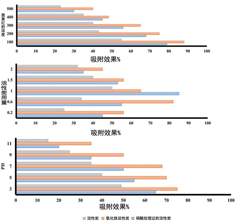 活性炭對(duì)茜素紅的吸附,本期我們使用三種類型的活性炭吸附劑來(lái)對(duì)茜素紅進(jìn)行吸附實(shí)驗(yàn),經(jīng)處理的活性炭和氧化鐵活性炭納米復(fù)合材料。吸附實(shí)驗(yàn)在分批條件下進(jìn)行。氧化鐵活性炭的pH值是6.7。其結(jié)果是,越低于pH值零電荷點(diǎn)越低,pH顯示酸性時(shí),氧化鐵活性炭對(duì)茜素紅的吸附是良好的。后面的吸附數(shù)據(jù)在我們實(shí)驗(yàn)中來(lái)呈現(xiàn)。