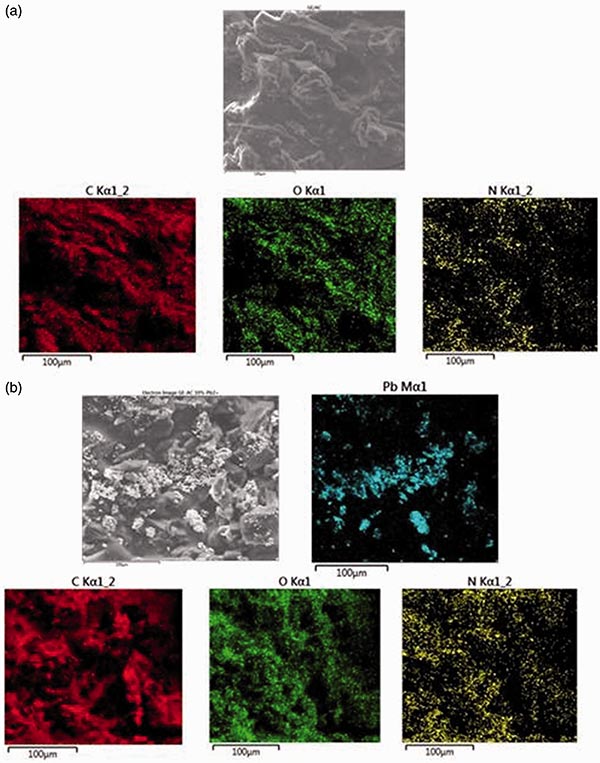 圖2.吸附鉛離子之前和(b)活性炭明膠復(fù)合材料吸附之后(a)的EDX點映射。