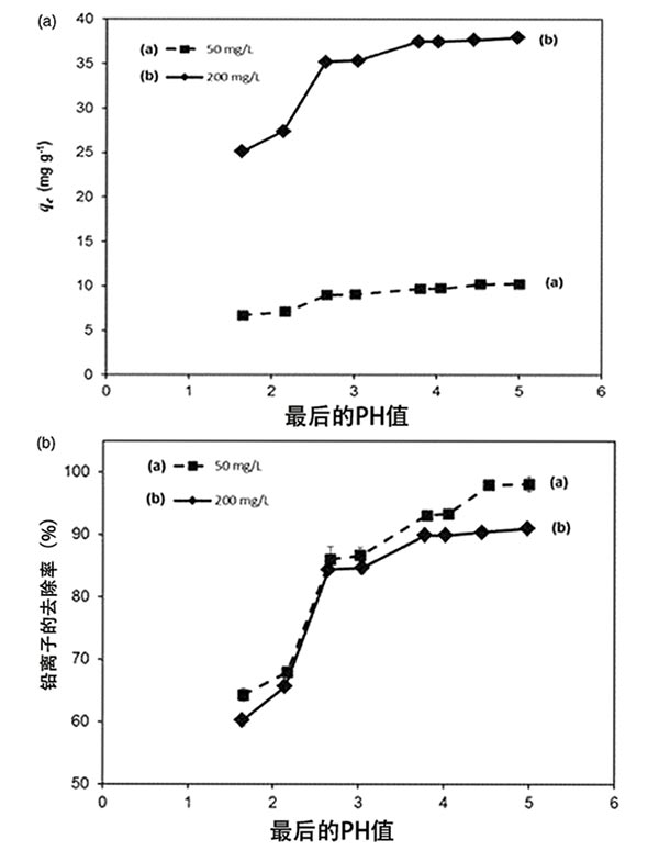 圖3.pH對活性炭明膠復(fù)合材料對鉛離子吸附的影響。活性炭明膠復(fù)合材料劑量0.15g/50ml,溫度23±2℃,鉛濃度(a)50mgl-1和(b)200mgl-1。