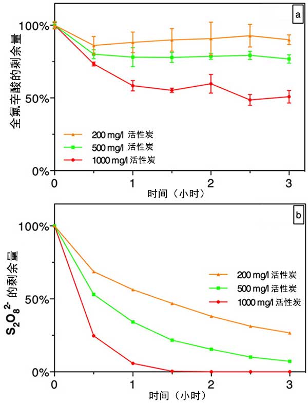 圖2。活性炭濃度對(duì)化學(xué)吸附去除全氟辛酸(圖2a)和過(guò)硫酸鹽分解(圖2b)的影響。