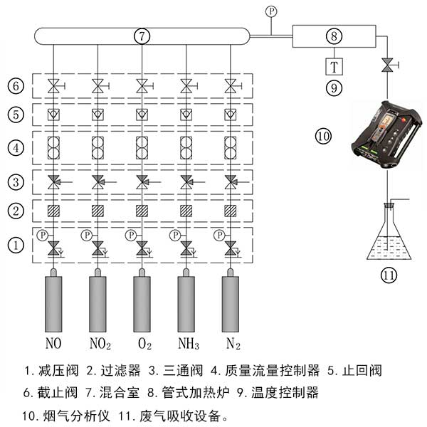 為了研究不同氣體組成,濃度和溫度對活性炭脫硝能力的影響,采用模擬氣體供應系統模擬真實柴油機廢氣。實驗系統如圖1所示。它主要包括供氣裝置,石英反應器,溫度控制裝置,煙氣分析儀和廢氣吸收裝置。供氣裝置主要包括氣瓶,減壓閥,質量流量控制器,混合室等。溫控裝置包括管式加熱爐和溫度控制器。N 2和O 2是高純度標準氣體。NO是含有N 2作為載氣的10%標準氣體,NO 2和NH 3也是如此。混合氣體中每種氣體組分的濃度由質量流量控制器控制。將石英反應器,內徑26mm,壁厚2mm,長300mm的空心圓筒放入管式加熱爐中。實驗溫度由溫度控制器控制,精度為±1°C。煙氣分析儀可以連續監測溫度和NO,NO 2的濃度采用電化學方法,采樣周期為1s的混合氣體和CO。為了防止廢氣污染空氣,通過煙氣分析儀的氣體被送到廢氣吸收裝置進行處理。