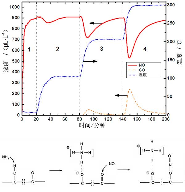 當溫度低于300℃時,作為還原劑的活性炭的脫硝能力差。為了進一步提高活性炭的脫硝能力,NH 3通常加入作為還原劑。如圖3所示,當入口氣體為1000μL/ L NO +1000μL/ L NH 3時,研究了活性炭在不同溫度下的脫硝能力。本文使用的煤質活性炭是酸性的,含酚羥基的官能團相對較高,促進了脫硝。它可以從之間的比較可以看出圖2和圖3中,加入NH后的趨勢和CO的濃度3基本上相同,而不NH 3,表明NH 3對含氧官能團的分解沒有效果。