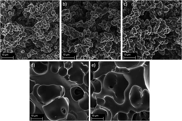 通過掃描電子顯微鏡對高比表面積活性炭進(jìn)行表征于圖2a-c中?梢钥闯龅氖沁@幾種活性炭具有它是由球形碳顆粒的尺寸與周圍3μm的孔隙網(wǎng)絡(luò)結(jié)構(gòu),這是典型的基于甲醛樹脂活性炭。球形活性炭納米顆粒的燒結(jié)導(dǎo)致孔隙網(wǎng)絡(luò)內(nèi)的空腔,其在直徑為2至20μm的形成。活性炭表面是光滑的,沒有燒結(jié)的球形活性炭納米顆粒,而它們?nèi)匀辉诰W(wǎng)絡(luò)內(nèi)具有相似直徑的空腔。由于在化學(xué)活化之前低的預(yù)碳化溫度,球形納米顆粒在活化過程中強(qiáng)烈聚集,這導(dǎo)致如前所述的較不剛性的孔隙網(wǎng)絡(luò)。