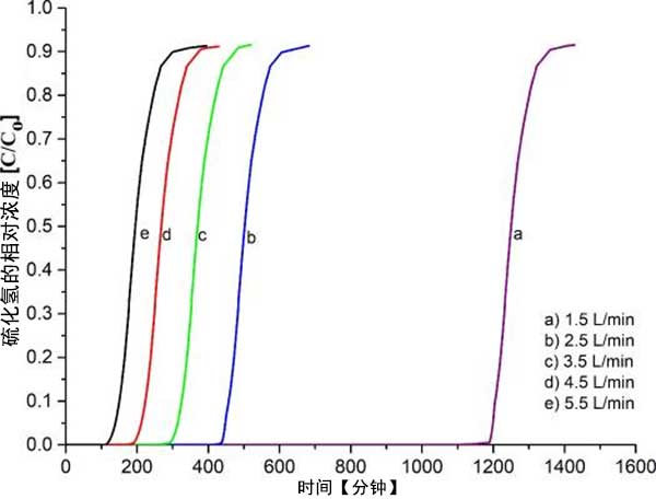 圖3:活性炭與混合氣體對進料流速影響的突破曲線。