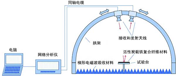 采用拱形法研究了電磁波吸收性能。測試裝置在圖1中示意性地示出。矢量網絡分析儀與接收和發射天線相連,其中一個具有增強和發射頻率電磁波的功能,另一個具有接收反射信號的功能。根據反饋信號強度,活性炭載鐵復合纖維材料的尺寸為180×180mm,厚度為2mm。