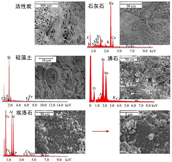 掃描電子顯微鏡(SEM)圖像和反應(yīng)材料的化學(xué)微范圍分析(EDS)如圖2所示。值得注意的是,活性炭樣品具有大膨脹的多孔表面,內(nèi)部孔隙的尺寸達(dá)到十幾微米到幾百微米。石灰石砂的SEM分析證實了這種材料的碳酸鹽特征,而鈣和氧的微區(qū)化學(xué)分析指向方解石(CaCO 3))。SEM-EDS分析表明硅藻土樣品中存在來自二氧化硅基團的礦物,并允許將該材料的巖相分類為硅藻土。SEM微圖像證實了中等發(fā)展的沸石和埃洛石的表面,并且在后一種材料的情況下,存在特征性的納米管,然而,在該放大率下不是非常明顯。此外,EDS光譜指出沸石樣品中存在:硅(Si),氧(O),鋁(Al),鉀(K),鈣(Ca)和鐵(Fe),以及:鐵(Fe) ,埃洛石樣品中的鋁(Al),硅(Si),鎂(Mg),磷(P),鈣(Ca)和鈦(Ti)。