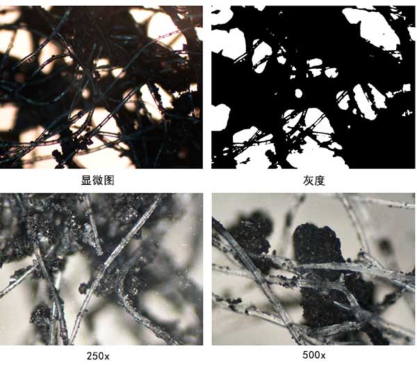 圖1:活性炭負載無紡布樣品的原始光學顯微鏡圖像與灰度表示。