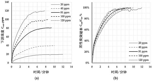 圖3:活性炭介質的下游濃度(a)和及時突破百分比(b)。