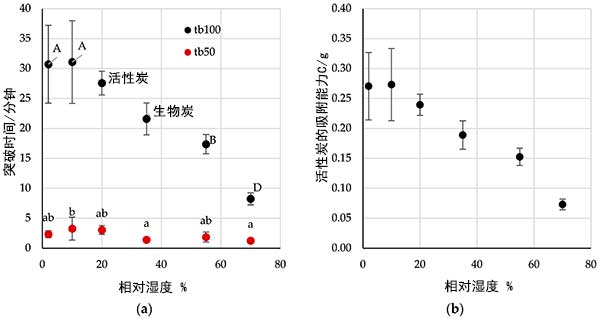 圖4:相對濕度對(a)校正突破時間和(b)吸附能力的影響。