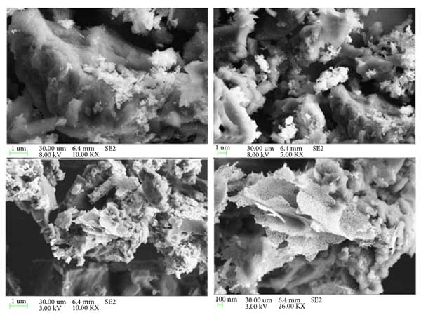 掃描電子顯微鏡分析:SEM研究證實了氧化鋅在活性炭載體上的負載,圖1示出了活性炭的SEM圖像。可以看出,活性炭呈細孔的不規則圖案。另外,氧化鋅顆粒沉積在活性炭的表面和孔中。仔細觀察表明活性炭表面上的片狀氧化鋅結構。