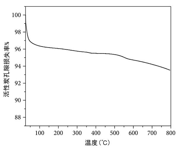 熱重分析:通過使用TGA分析研究了合成催化劑活性炭的熱穩定性。發現催化劑是穩定的,并且在450℃的溫度下記錄了約2%的重量損失(圖3),并且可以清楚地看出浸漬降低了碳含量并因此導致孔隙的減少。
