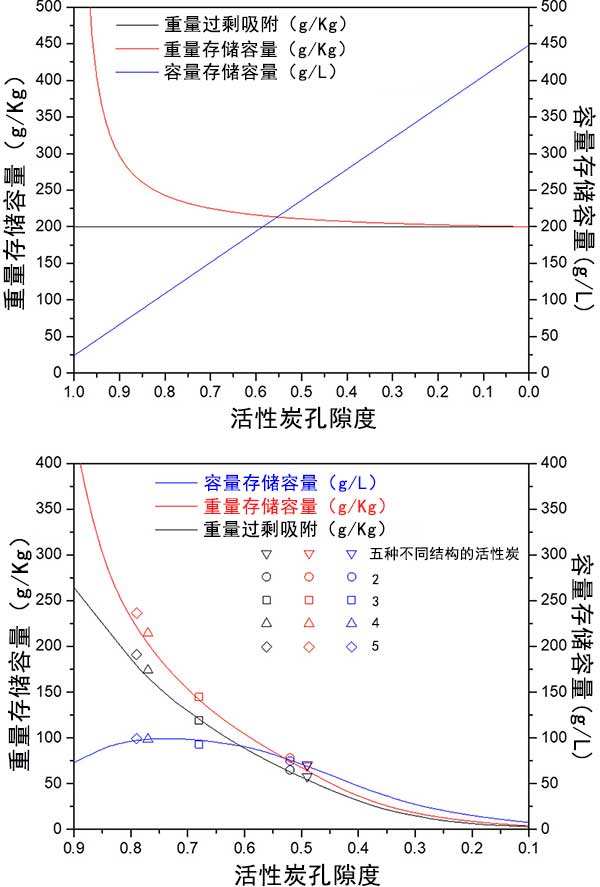 圖4顯示了兩種活性炭的重量和體積存儲(chǔ)容量之間的相互依賴性。實(shí)驗(yàn)吸附測(cè)量與第二模型一致,將孔隙率和表面積作為因變量處理。經(jīng)過(guò)對(duì)比活性炭樣品的實(shí)驗(yàn)性過(guò)量吸附,重量?jī)?chǔ)存容量和體積儲(chǔ)存容量。圖3和圖4將理論模型與實(shí)驗(yàn)數(shù)據(jù)進(jìn)行比較。它表明,所開發(fā)的模型是通用的,并預(yù)測(cè)任何活性炭樣品的重量和體積儲(chǔ)存容量之間的相互依賴性。結(jié)果也適用于金屬有機(jī)骨架。雖然實(shí)驗(yàn)結(jié)果比較好的活性炭不具有較高的表面積,但孔隙率在0.65和0.75之間。通過(guò)使用化學(xué)粘合劑將活性炭粉末壓縮成整料,實(shí)現(xiàn)了更高的體積儲(chǔ)存容量。整體的體積儲(chǔ)存容量使用整體式整體密度而不是活性炭的表觀密度或金屬有機(jī)框架材料的單晶密度來(lái)計(jì)算。