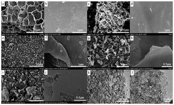 通過SEM和TEM研究了空氣氧化前后活性炭的微觀結(jié)構(gòu)(圖2)。在(圖2a,b)中,軟木材料呈蜂窩狀結(jié)構(gòu)并具有明顯的褶皺。在800℃碳化后,保留結(jié)構(gòu)并且包含該結(jié)構(gòu)的部分彼此緊密結(jié)合,看起來光滑(圖2c,d)。在350℃-450℃下空氣活化后,結(jié)構(gòu)單元被分離形成薄片(圖2e),這可歸因于細(xì)胞之間木質(zhì)素的降解;钚蕴砍尸F(xiàn)出層狀空氣氧化后的結(jié)構(gòu)(圖2的e-j)的。350℃和400℃活化的活性炭樣品表面相對光滑,在0.5-1μm的分辨率下未觀察到明顯的孔結(jié)構(gòu)(圖2f,h)。當(dāng)氧化溫度升至450℃時(shí),活性炭的表面顯著變化并觀察到大量的孔。圖2j顯示450℃活化樣品顯示出具有裂縫和空隙的粗糙表面。TEM結(jié)果(圖2k,i)顯示450℃活化的活性炭具有三維(3D)互連框架的分級(jí)微/中孔結(jié)構(gòu)。這些孔可以有助于廢水中染料的吸附。