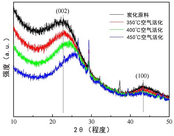 圖3顯示了空氣氧化之前和之后活性炭的XRD圖譜。所有樣品在~24°處顯示典型的寬峰,在~43°處顯示弱峰,分別對應(yīng)于石墨碳的(002)和(100)平面。所有樣品的寬峰和弱峰反映了活性炭的低度石墨化。與炭化原材料相比,隨著氧化溫度的升高,(002)峰逐漸向較高角度移動(dòng)。該運(yùn)動(dòng)表明空氣氧化后石墨結(jié)構(gòu)中(002)晶面的d-空間減小。結(jié)果表明,活性炭的空氣活化導(dǎo)致石墨結(jié)構(gòu)具有改善的致密性。
