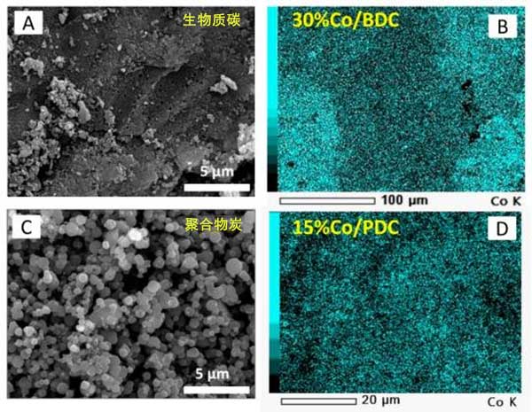 使用掃描電子顯微鏡(SEM)觀察由植物殼和酚醛樹脂的熱解獲得的活性炭的表面形態,并分別在圖1A,C中示出?梢钥闯觯煌奶记绑w產生不同的表面形態。生物質衍生的碳顯示出剛性和致密的結構,這是典型的木炭特征。而聚合物衍生的碳呈現具有粒子網絡的碳球,在球體之間產生大的空隙。然后將兩種活性炭用作氧化鈷的載體。為了觀察金屬氧化物在活性炭上的分散,進行了SEM與能量色散X射線(EDX)的元素映射。圖1B,D表示裝載在兩種材料中的氧化鈷的代表。所有都顯示鈷材料(在青色中顯示)在活性炭中的均勻分散。這表明通過浸漬方法中描述的簡單化學計量計算很好地實現了元素鈷的目標負載。換句話說,上述結果清楚地顯示了制備氧化鈷活性炭的成功制備步驟。