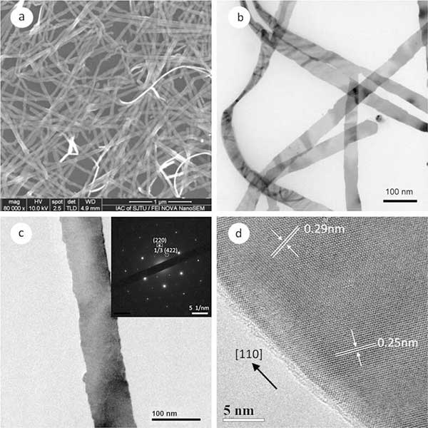 圖1顯示了在活性炭上生長的銀納米帶的典型電子顯微鏡(EM)圖像。SEM圖像(圖1a)顯示獲得了豐富的線狀產(chǎn)物,具有非常少的準(zhǔn)球形顆粒雜質(zhì)。圖1b是銀納米帶的典型TEM圖像。該圖中所示的納米帶的平均寬度為約45納米。從左側(cè)附近的扭曲納米帶測量的厚度為約9納米。位于TEM網(wǎng)格上的這種平坦且光滑的納米結(jié)構(gòu)也通過右側(cè)的莫爾圖案來證實(shí),其源自具有不同晶體取向的兩個(gè)或三個(gè)納米帶的堆疊。圖1c呈現(xiàn)單個(gè)納米帶的TEM圖像。其選擇區(qū)域電子衍射(SAED)圖案插入右上角,具有六重對(duì)稱性。