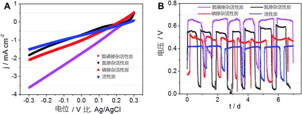 不同摻雜比的活性炭催化劑在微生物燃料電池中的實際性能,各種氧化還原催化劑的空氣陰極。線性掃描伏安法曲線由圖3A表明,所有的空氣陰極具有摻雜碳改性的活性炭催化劑表現出比原始活性炭催化劑的更高電流響應。與氮摻雜和磷摻雜相比,氮磷共同摻雜的活性炭顯示高電流密度。如圖3B所示,使用雙摻雜的活性炭催化劑的空氣陰極燃料電池能夠在1000Ω的外部電阻上產生0.668V的穩定電壓,這遠高于本期制造的其它催化劑。這些結果意味著摻雜碳的改性是增強活性炭的氧化還原活性的可靠方法。此外,當在微生物燃料電池的空氣陰極中用作氧化還原時,由氮和磷共摻雜碳改性制備的活性炭優于氮磷單獨摻雜改性的活性炭。
