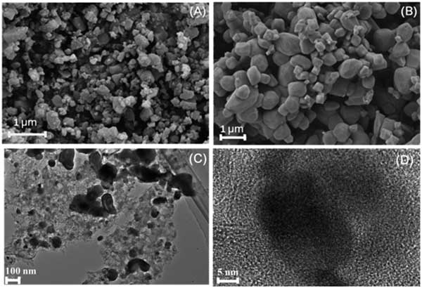 圖1:鐵材料(A)和活性炭(B)的SEM圖像,活性炭的高分辨率透射電子顯微鏡圖像(C和D)。
