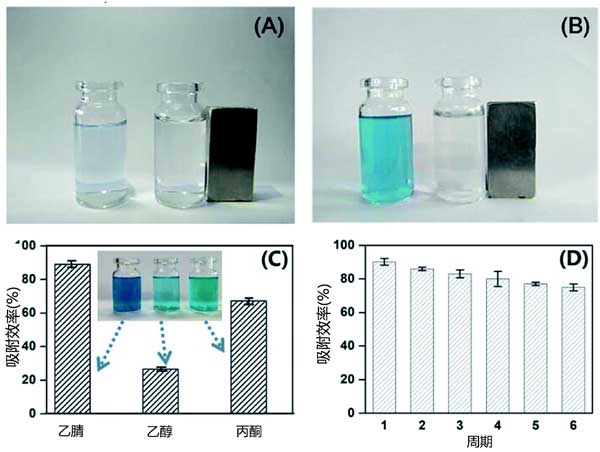 活性炭的回收和再利用是在實際應用中需要考慮的關鍵因素。因此,我們調查了活性炭的恢復和可重用性。通過外部磁體很容易將活性炭與水溶液分離(圖3A和B)。通過使用乙腈,乙醇和丙酮作為洗脫液輔助超聲來再生裝載孔雀石綠的活性炭。乙腈的解吸效率優于乙醇和丙酮,解吸效率分別為90.2%,35.7%和71.3%(見圖3C)。活性炭在解吸和再生后是穩定的。此外,六個循環后沒有明顯的吸附效率損失(圖3D)。對活性炭的快速吸附,大吸附容量和良好的可重復使用性促使我們研究其實際應用。將活性炭分散在含有加標孔雀石綠(25mg L-1)的廢水中。在用外部磁體快速吸附和分離活性炭后獲得澄清的上清液(圖3A和B)。結果表明,活性炭是一種經濟有效的高性能吸附劑,用于孔雀石綠吸附和去除廢水。