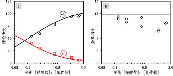 圖2a和圖2b顯示了平衡電吸附數據分離因子沒有和離子吸附容量作為的函數硝酸鹽至氯化物溶液中的濃度比。我們觀察到了平衡電吸附數據與離子吸附容量一起增加硝酸鹽至氯化物進料溶液中的濃度比。在圖2b中,我們看到隨著初始增加硝酸鹽至氯化物氯-濃度比,濃度之差硝酸鹽和氯化物在微孔中增加。然而,在達到平衡之前,優先離子電吸附由初始濃度比確定:溶液中具有最高濃度的離子主要是電吸附的。
