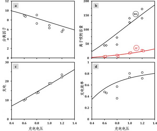圖3a顯示了這一點分離因子隨充電電壓降低,但親和效應不會減少很多,并且在高電壓下也繼續發揮重要作用。充電和離子吸附容量隨充電電壓的增加而增加。圖3d顯示充電效率遠低于單位,這可以通過在充電步驟開始時從活性炭表面解吸共離子來解釋。