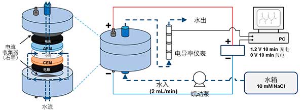方案1中描述了用于檢查脫鹽性能的膜電容去離子系統。每個電極由作為集電器的石墨,交流電極和IEM組成。將陰離子交換膜和陽離子交換膜分別放在陽極和陰極上。一對電極由厚度為110 µm的尼龍墊片隔開。使用蠕動泵將進料水供應到電解池。處理后的溶液直接流過電導率儀,隨后使用單程模式。除了IEM的存在外,還以與電容去離子中使用的相同配置進行了CDI實驗。使用電池循環器在1點分別施加電壓10分鐘。在充電步驟中為2 V,在放電步驟中為0V。從第三個循環獲得數據,并從至少三個操作中計算出平均值,以實現可重復性。