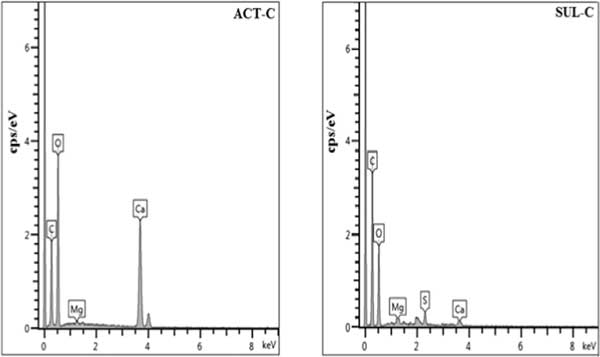 各種尺寸的活性炭和磺化炭的SEM圖像形態如圖1所示。。ACT-C和SUL-C催化劑的SEM圖像表明,白點代表無機成分。從圖像可以看出,活性炭具有不規則的致密結構,而顆粒看起來像具有光滑表面的顆粒。圖2顯示了ACT-C和SUL-C催化劑的EDX圖,并觀察到SUL-C圖中存在硫。此外,在ACT-C和SUL-C的圖中,還有一些額外的峰涉及雜質,因為碳源是廢物生物質,因此可能存在這些雜質。如圖3所示,通過TEM分析了活性炭和磺化炭的形態和結構。該TEM圖像ACT-C催化劑的“A”表示僅存在微孔,而SULC催化劑則顯示了“微孔”和“中孔”,這是由于活性炭材料上的磺化作用所致,在活性炭材料中產生了中孔。