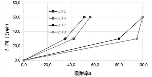 研究了pH值對三甲胺在活性炭上吸附的影響。在該過程中,發生吸附現象的溶液的pH值是非常重要的參數,尤其是在三甲胺為布朗斯臺德堿的情況下。在官能團和吸附劑表面之間產生的靜電荷的大小主要取決于介質的pH。在pH值為2、4、7和9的情況下,用0.200g的活性炭測量了在0、30和60分鐘時三甲胺的吸附百分比,結果總結在圖3中。