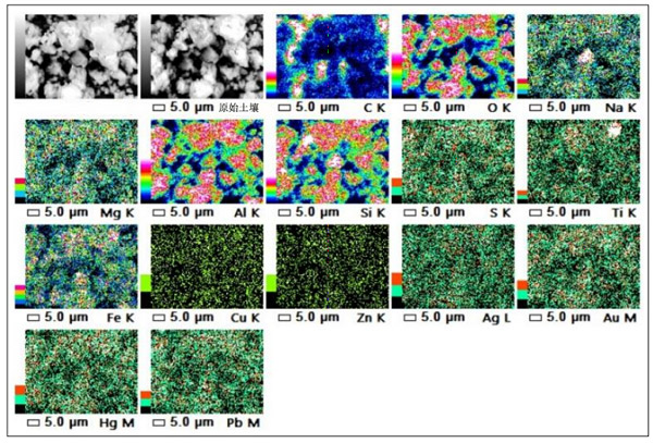 SEM-EDS測試使用了三個樣本,即A區域樣本,B區域樣本和原始土壤樣本。分析了這三個樣品。尋找的參數是充當污染物的重金屬元素。該測試的結果顯示了土壤中存在的元素的質量百分比。掃描電鏡是一種用于表面觀察的工具,其焦點深度大于光學顯微鏡,可以直接觀察復雜的表面而無需復制。SEM圖像顯示出樣品的形態狀態,顯示出大小不規則的團塊。同時,EDS分析非常適合揭示樣品中的化學元素和化合物。EDS的元素映射將為對象表面上的每個元素賦予不同的顏色,并定量分析每個元素的百分比。