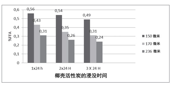 可以得出結論,使用活性炭長時間的浸泡和小的顆粒尺寸效果比較好。另外,浸漬時間,粒度和活性炭吸附劑類型對減少食用油的游離脂肪酸數量有影響。