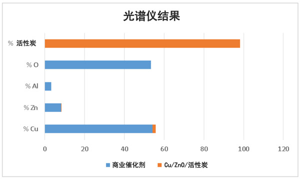 活性炭催化劑的制備,采用浸漬法制備了Cu/ZnO/活性炭催化劑。硝酸銅和硝酸鋅是將附著在活性碳上的銅和氧化鋅載體的原材料。Zn起促進(jìn)劑的作用,以防止Cu的燒結(jié)。銅將在催化劑上被氧化并寫為銅[Zn]。之后,來(lái)自CuO分子將為CuO/ZnO相的形式。其還原將受到ZnO的影響。制備活性炭催化劑后,然后通過(guò)XRF,XRD,SEM和BET表面積分析儀對(duì)催化劑進(jìn)行表征。商業(yè)催化劑和Cu/ZnO/活性炭催化劑的XRF分析見(jiàn)圖2。