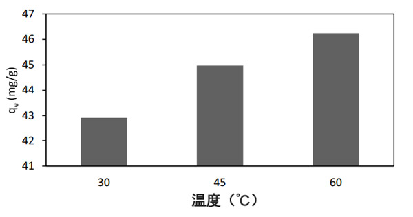 溫度對吸附過程有顯著影響,因為溫度的變化會引起吸附劑對特定吸附物的平衡吸附能力的變化。因此,如圖3所示,通過將溶液溫度從30-60°C改變來研究溶液溫度對染料去除的影響。隨著溫度從30-60升高,對甲基黃的吸附容量從42.9 mg/g增加到46.2 mg/g。溫度表明吸附反應本質上是吸熱的。眾所周知,由于溶液粘度的降低,溫度升高會增加被吸附物分子在外邊界層以及在活性炭顆粒內部孔中的遷移率或擴散速率。
