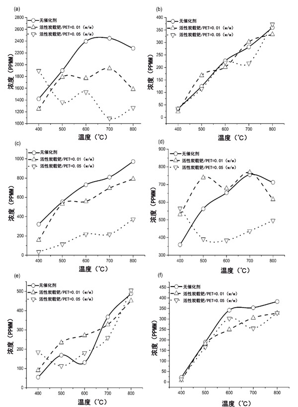 活性炭載鈀催化劑的高表面積歸因于活性炭載體。盡管金屬負載量為5 wt%,高表面積仍可實現高鈀分散度(42%)。已知活性炭具有很高的熱穩定性,因此在熱解過程中大部分保留了活性炭的孔隙率。圖1顯示了在有和沒有鈀催化劑的情況下,由PET熱解獲得的多環烴和聯苯衍生物的濃度比較。使用不同的活性炭載鈀催化劑/PET比確定熱解過程中催化劑的作用。隨著熱解溫度的升高,三種類型的多環烴(2-萘甲酸,芴酮和三亞苯基)的濃度增加,這是因為環化反應在較高溫度下更有利地形成了苯環。