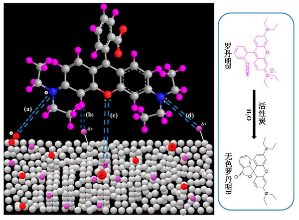 羅丹明B降解機(jī)理示意圖。活性炭的表面上存在幾個(gè)官能團(tuán),它們可以與羅丹明B染料分子相互作用。可能的相互作用簡(jiǎn)述如下:(a)活性炭的–COOH基團(tuán)與羅丹明B的負(fù)電性基團(tuán)之間的相互作用,(b)活性炭的–OH基團(tuán)與羅丹明B的芳環(huán)之間的氫鍵,(c)氫鍵活性炭的–OH基團(tuán)與羅丹明B的x噸基團(tuán)之間存在(d)活性炭和羅丹明B染料分子的表面官能團(tuán)之間的靜電相互作用。