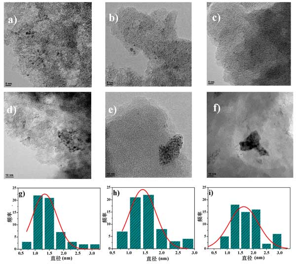 活性炭載釕催化劑獲得的TEM圖像如下。必須提到的是,盡管通常觀察到分散良好的釕納米顆粒(圖1 a–c),但也發現了一些顆粒團聚(圖1d–f),特別是在使用最氧化的活性炭載體。顆粒大小分布已在圖1g–i中以條形圖繪制,分別為幾種不同活化后的活性炭載體制成的催化劑平均顆粒大小分別為1.3、1.4和1.6 nm。一般而言,TEM數據表明,所用的浸漬方法成功地在活性炭材料上形成了小的釕納米顆粒(平均尺寸小于2 nm),并且似乎隨著載體的氧化,其粒徑略有增加。這可以涉及到的釕前體的氧官能團的錨固,和它們的部分分解的還原熱處理期間的效果,這可能導致一些金屬燒結。